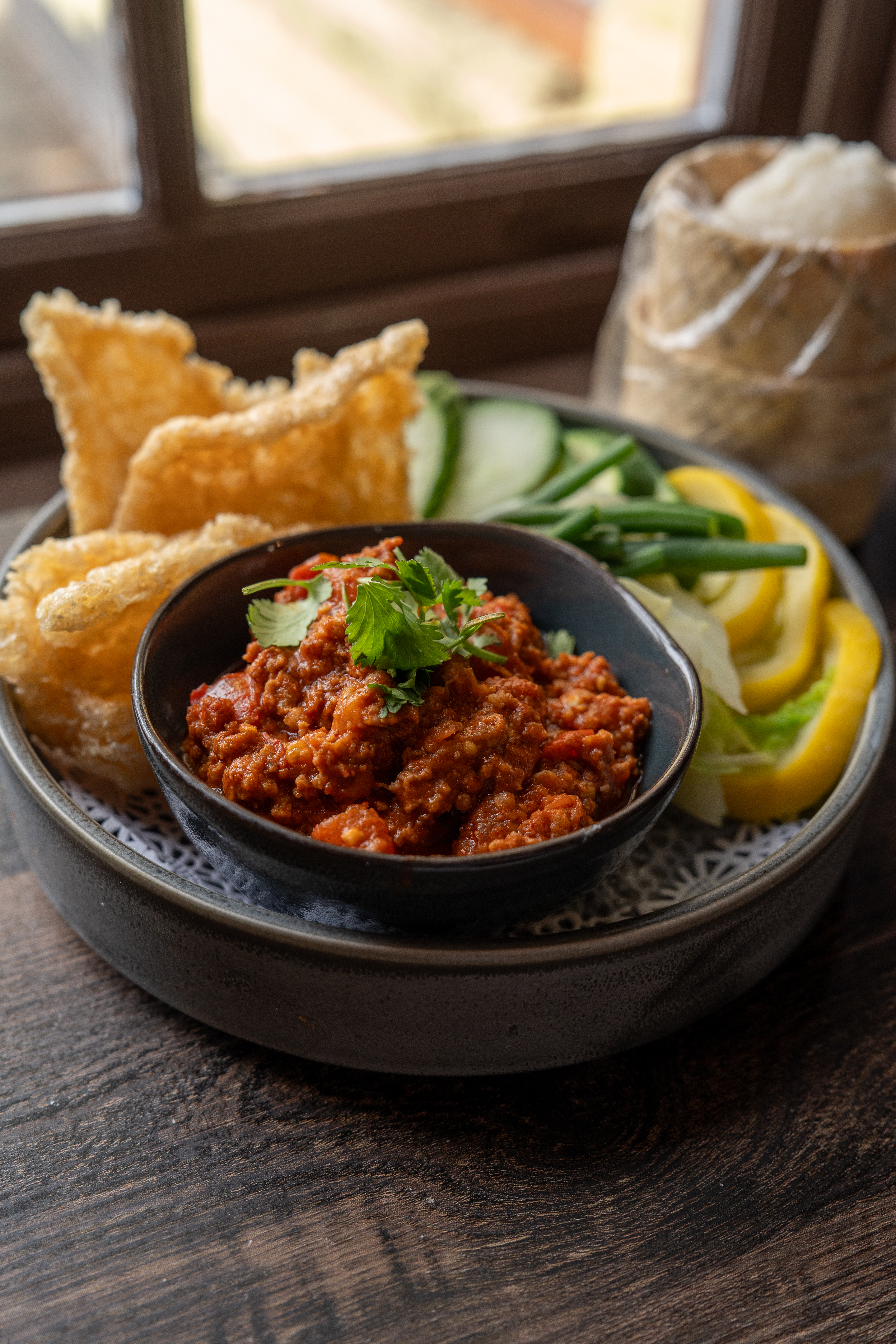 This Northern Thai chili dip combines kurobuta pork with a fragrant paste of chili, garlic, and shrimp for a punch of heat and umami. Stir-fried with tomatoes and seasoned with soy sauce, the dip is served alongside sticky rice and fresh vegetables for dipping. Bold, spicy, and deeply savory, it’s a dish that embodies the vibrant flavors of northern Thailand.