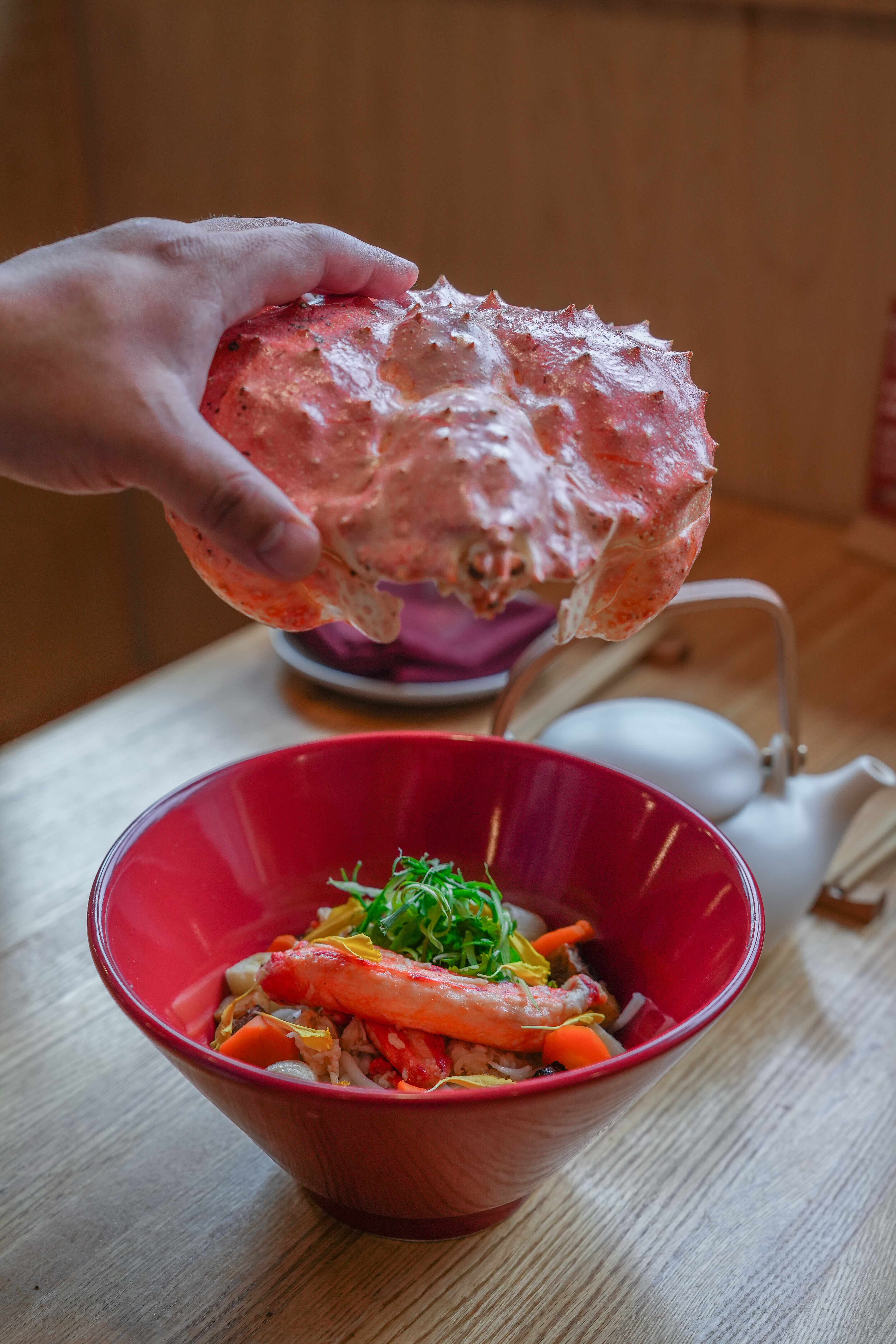 A modern Yunnanese rice noodle dish built around a live Norwegian king crab, which is steamed until the meat is halfway cooked, then finished in warm butter. The broth is made from the crab's shells, head fat, roasted leeks, ginger, and pork broth, thickened with an egg white and poured tableside from a kettle. The bowl is assembled with butter-poached vegetables, mushrooms, scallions, and edible flowers — a fusion of traditional Yunnanese mixian with elevated, butter-forward Midwestern cooking techniques.