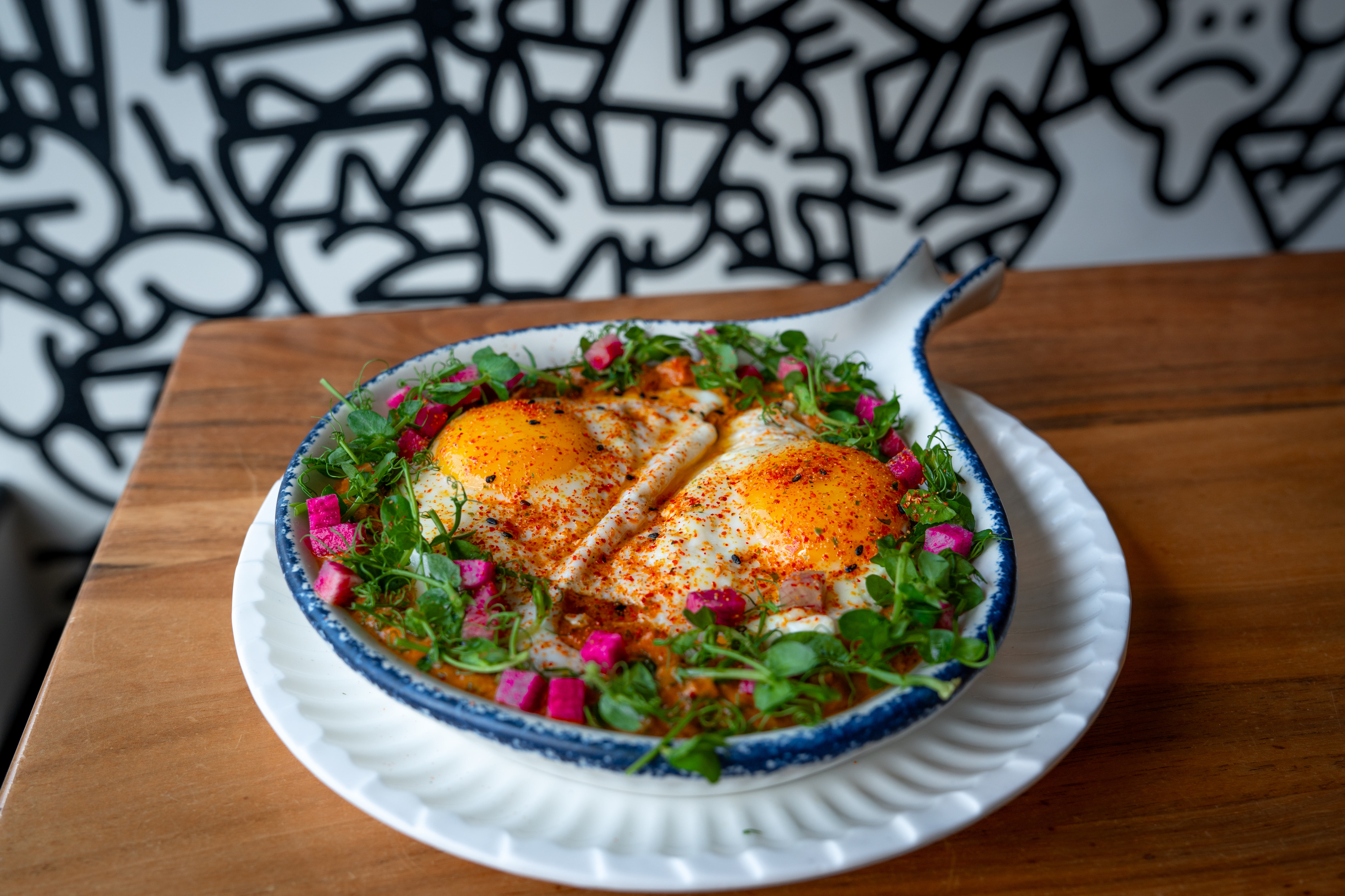 The signature dish at Unconventional Diner is a sweet potato shakshuka, a creative twist on the traditional Middle Eastern dish. It features a curry-style base with roasted sweet potatoes, chickpeas, and a medley of spices, topped with a sunny-side-up fried egg. Garnished with fresh herbs, affilla cress, and watermelon radish, the dish is hearty, vibrant, and full of bold flavors.